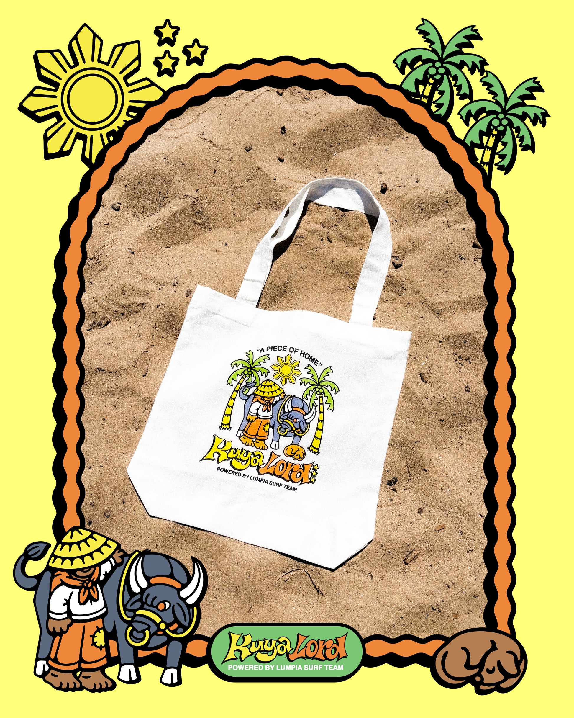 Pack your pride and hit the streets with the Kuya Lord Tote Bag, a limited-edition Lumpia Surf Team x Kuya Lord collab. This cream canvas stunner features "A Piece of Home" crowning a lush Pinoy paradise: swaying palms, blazing sun, salakot fisherman steering a carabao, plus that fiery "Kuya Lord" logo and "Powered by Lumpia Surf Team" tag. Perfect for hauling lumpia runs, beach gear, or daily essentials—tropical vibes, urban utility.